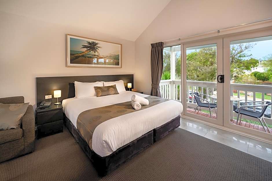 Located upstairs, this suite features high cathedral ceilings and a balcony offering pool views. There is a king sized-bed and a single sized king-sized bed, both with electric blankets. The private bathroom features a walk-in shower, vanity, hairdryer and toiletries. There is a split-system air conditioner unit located in the room